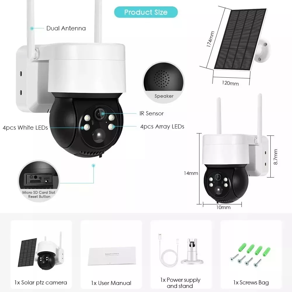 Autonomía Solar Permanente: Equipada con un panel solar de bajo consumo y 6 baterías internas, la cámara se mantiene activa las 24 horas sin necesidad de instalaciones eléctricas complejas.